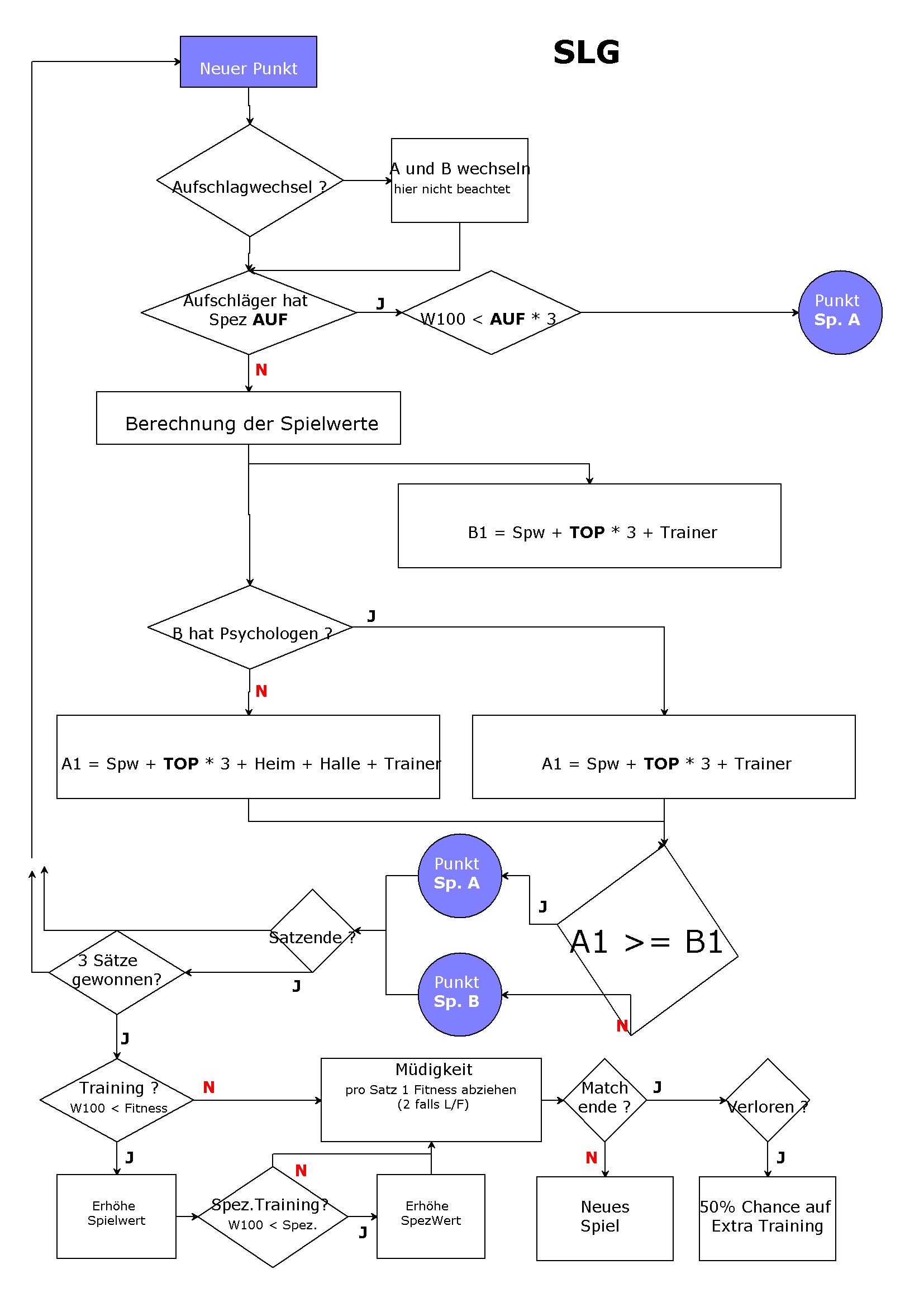Im Spiel werden einfach die Spielstärken + ein 100 seitiger Würfelwurf verglichen, wenn der Rückschläger mehr hat, hat er den Punkt, sonst der Aufschläger. Der Heimspieler hat 5 Punkte Bonus!
